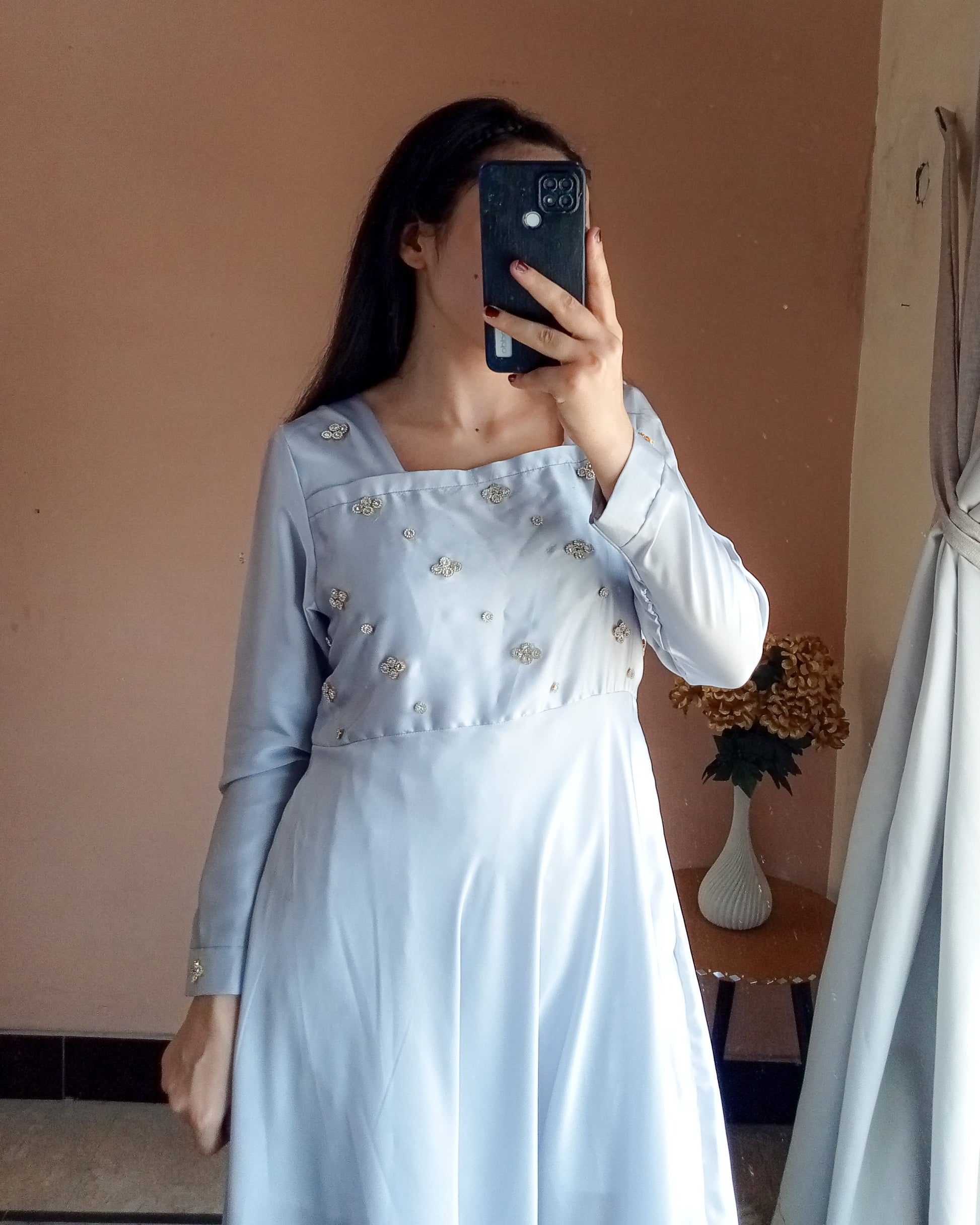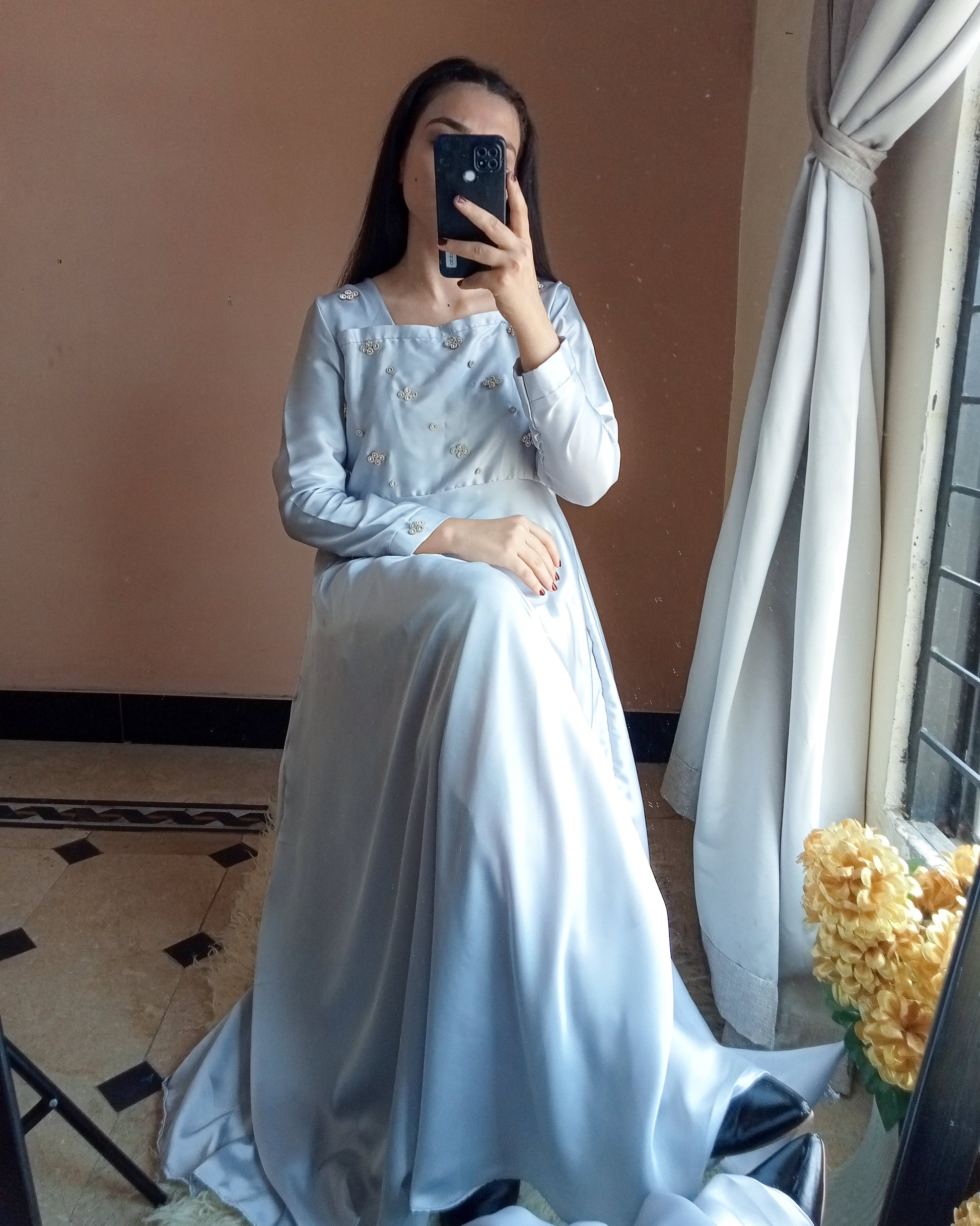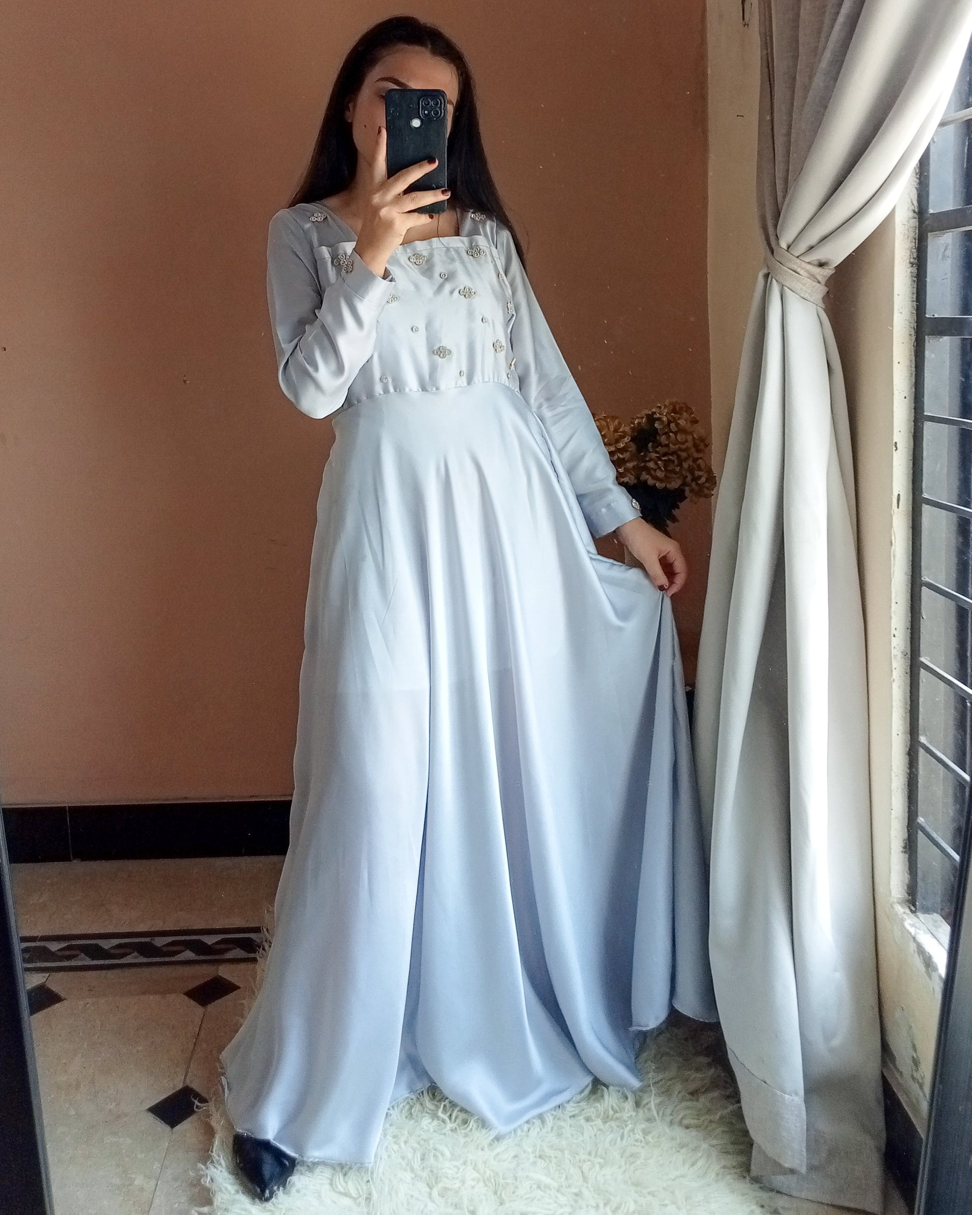 This stunning deep light gray silk frock is a showstopper! The top is adorned with intricate embellishments featuring golden stones, adding a touch of luxury and glamour. This dress is perfect for making a grand entrance and turning heads at any special occasion!