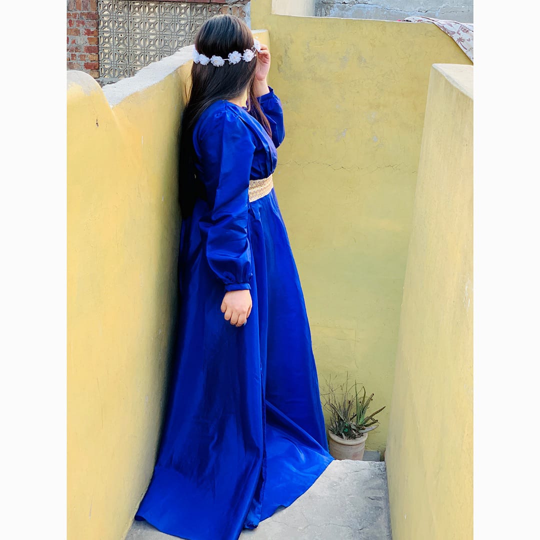 Regal elegance personified! This stunning long royal blue Kathan silk frock features an exquisite embroidered waist design, perfect for making a statement at any occasion. The luxurious silk fabric drapes elegantly, accentuating your beauty. Embrace your inner queen and shine in this majestic piece!